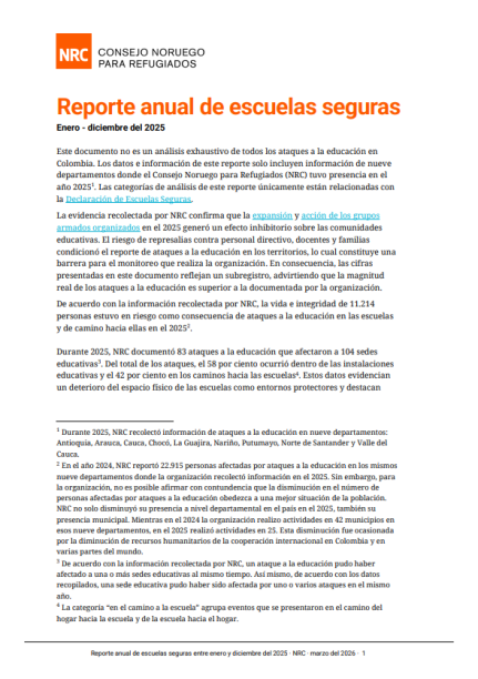 Este documento no es un análisis exhaustivo de todos los ataques a la educación en Colombia. Los datos e información de este reporte solo incluyen información de nueve departamentos donde el Consejo Noruego para Refugiados (NRC) tuvo presencia en el año 2025. Las categorías de análisis de este reporte únicamente están relacionadas con la Declaración de Escuelas Seguras