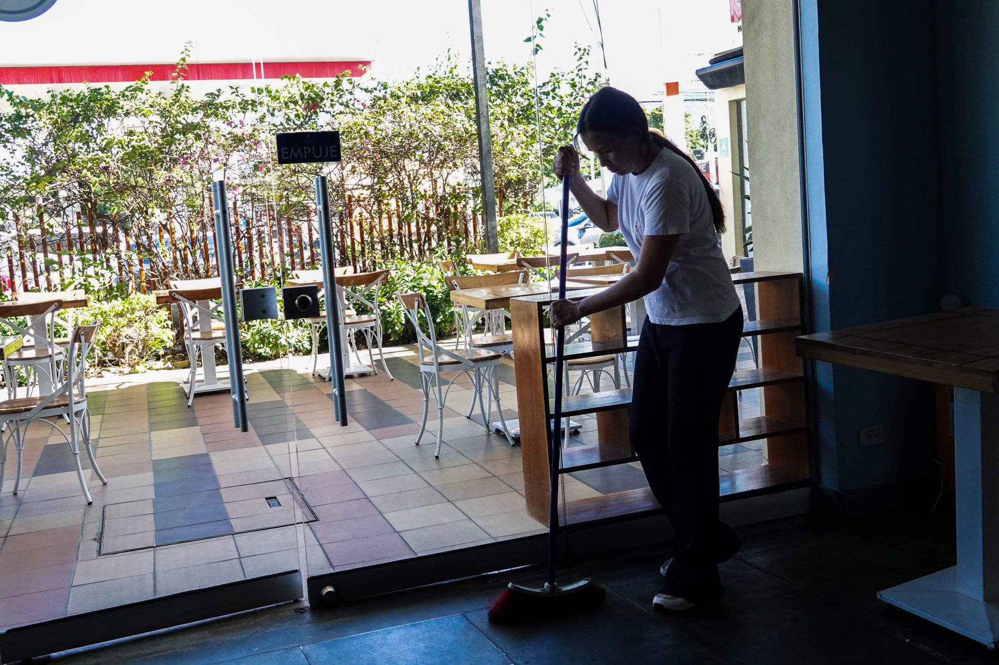 Paola realiza la limpieza del restaurante donde trabaja antes de iniciar la jornada.
