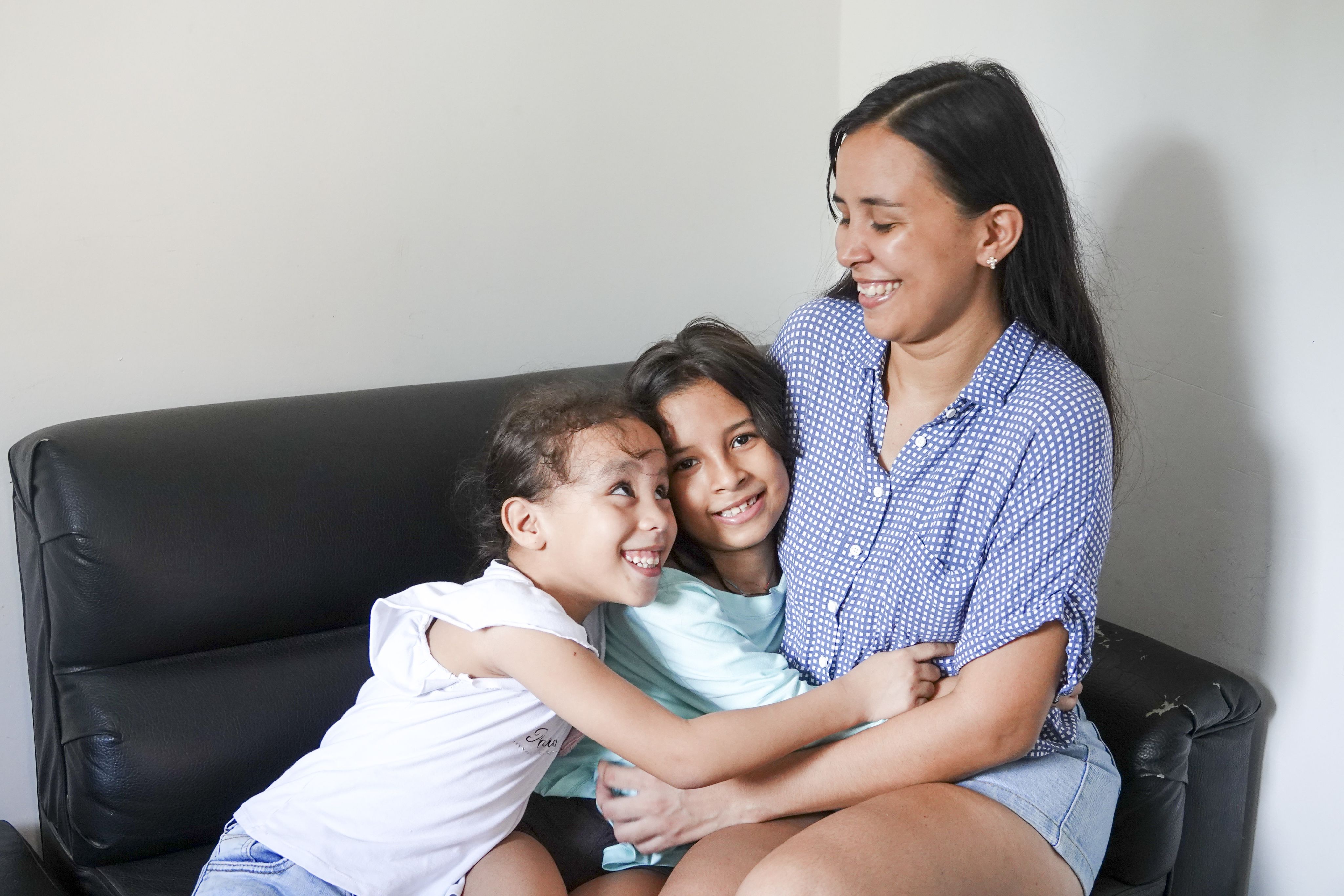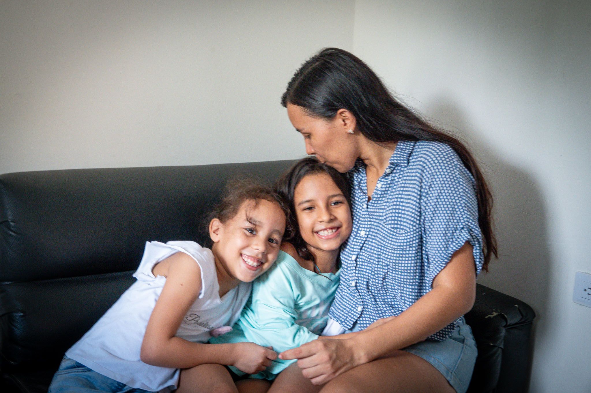 Paola junto a sus dos hijas en la sala de su casa, donde también vive con su madre y su hermano.