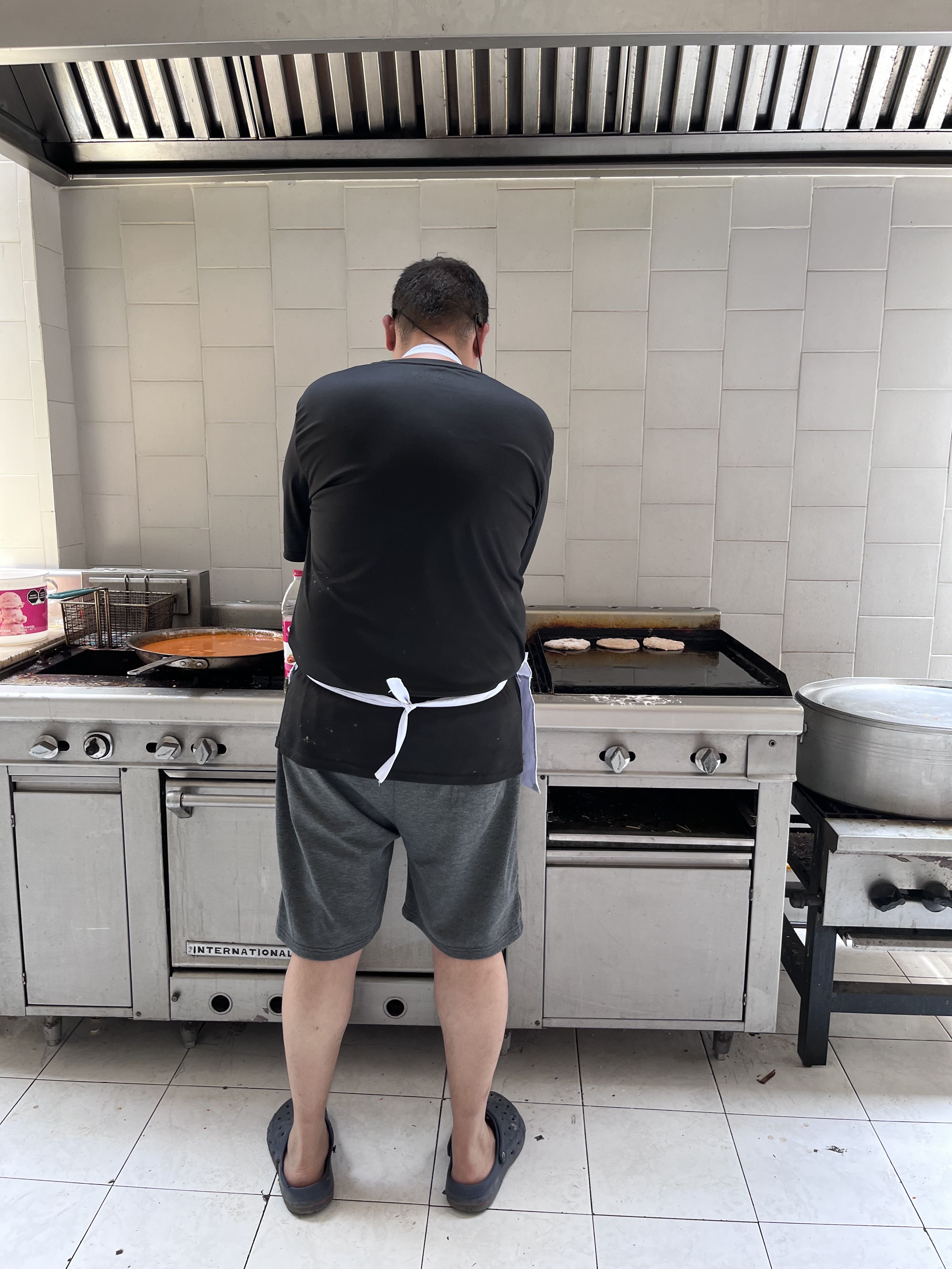 Enrique cocina en el albergue donde vive mientras espera a que le otorguen una cita a través de CBP One.