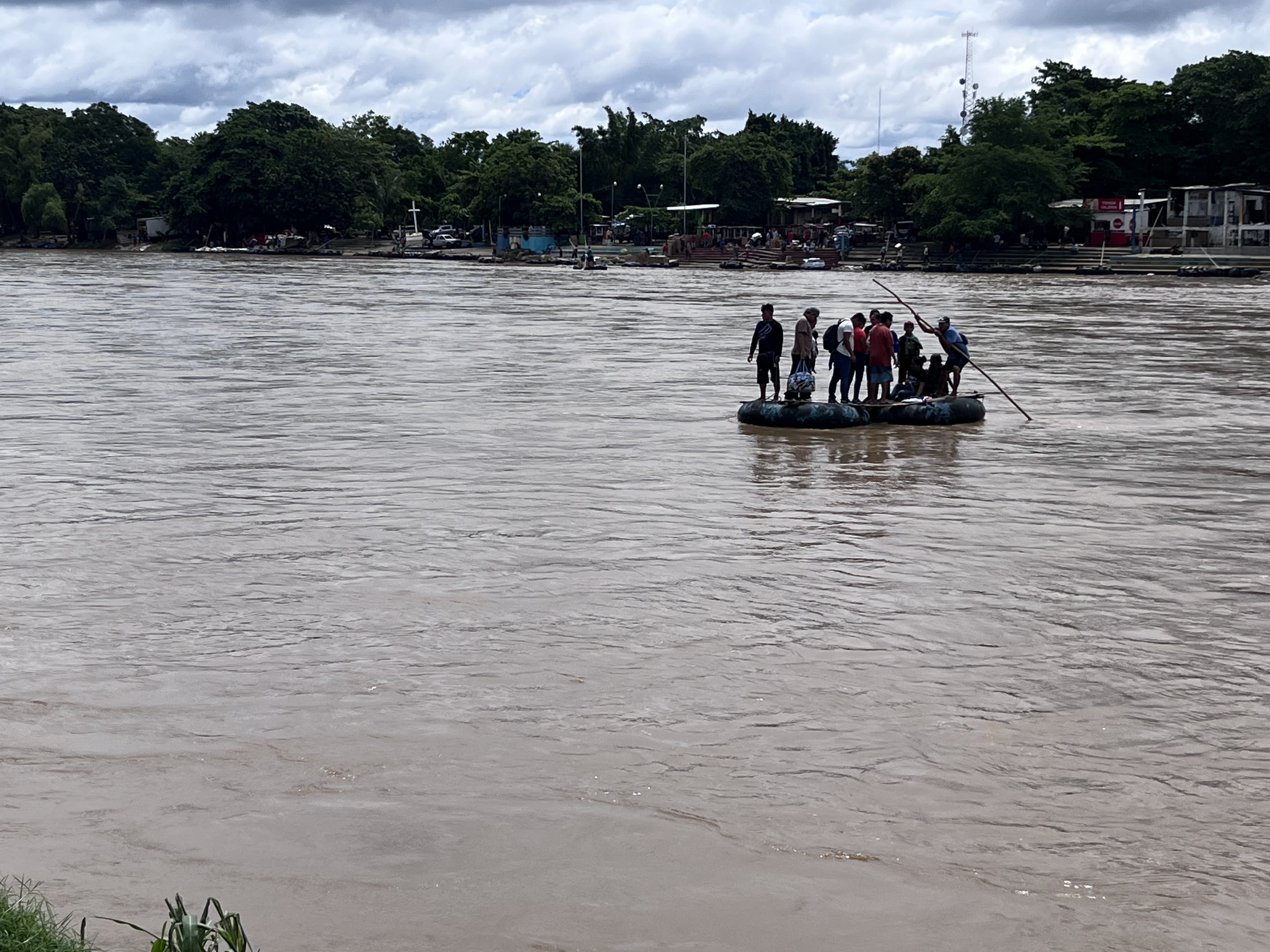 Personas refugiadas y migrantes cruzando el río Suchiate para llegar desde Guatemala a Tapachula, México.