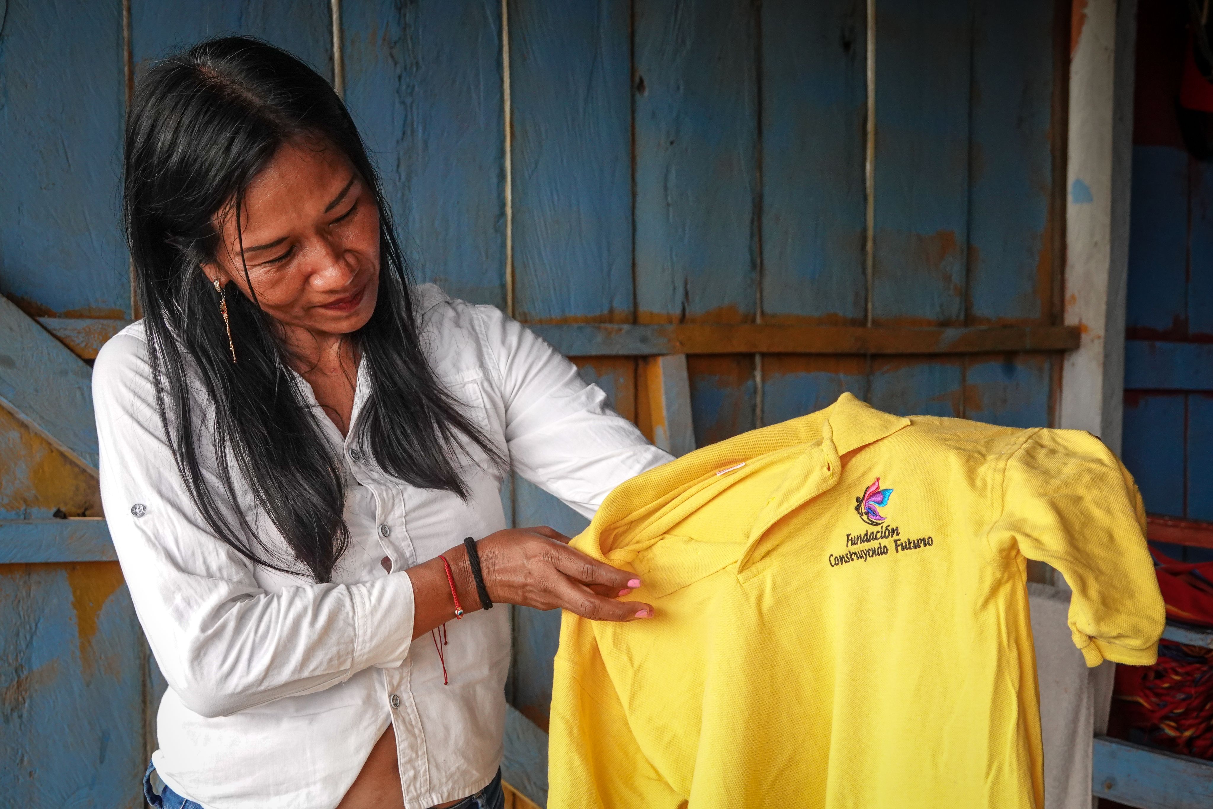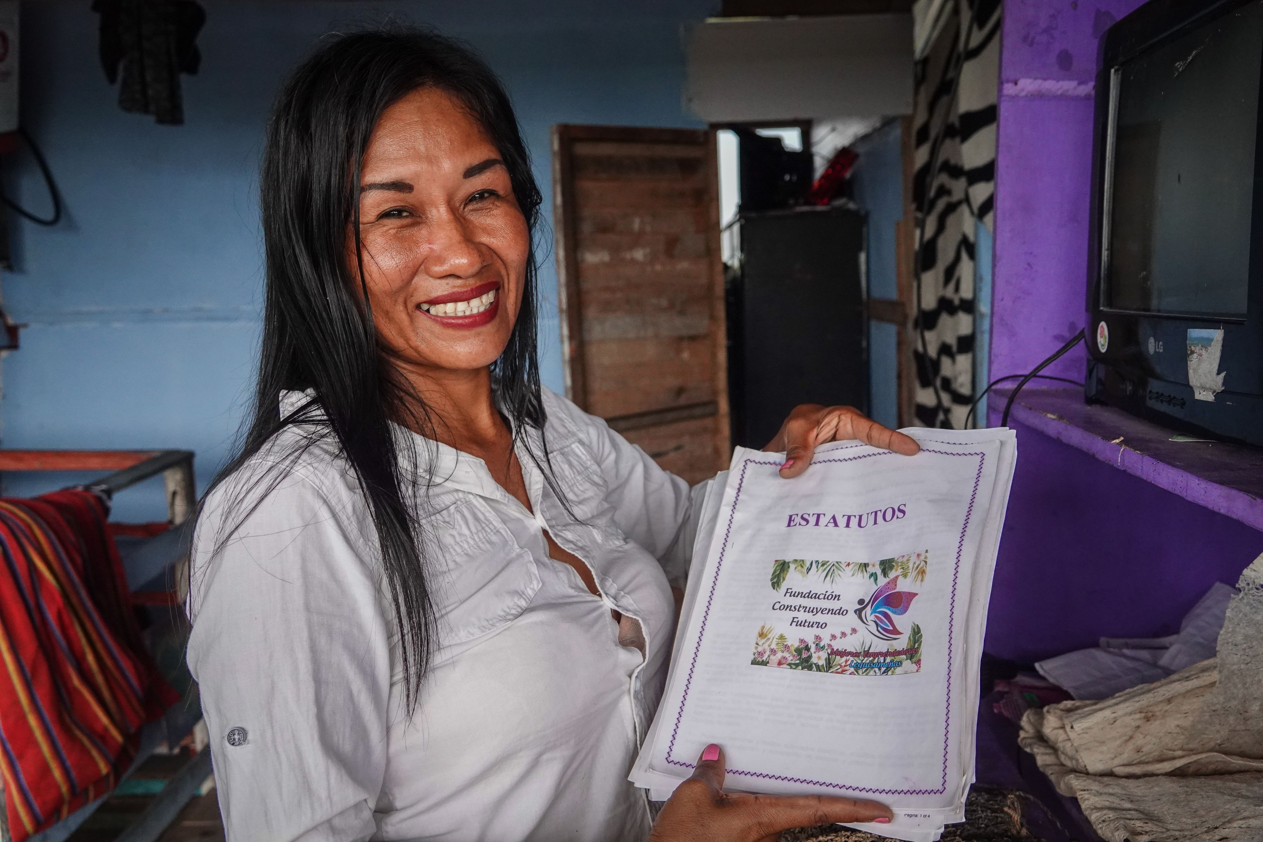 Ella lidera su fundación de mujeres víctimas del conflicto armado, donde trabaja para que ellas conozcan sus derechos, participen en formaciones y accedan a oportunidades y medios de vida.